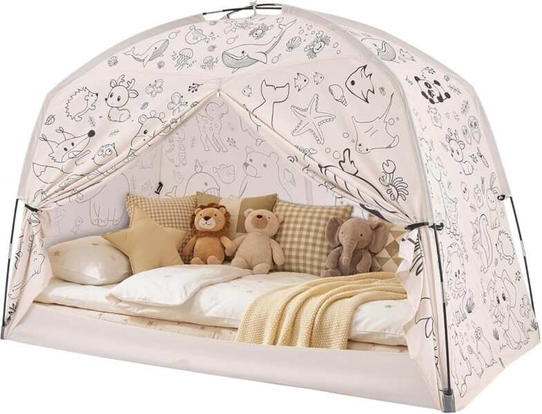 Customer Review: I never imagined a tent could be both a play space and nap spot for my kid! It works anywhere—on the bed, floor, indoors or out, set up instantly. My daughter is obsessed with the animal patterns; she started coloring on it the second we unboxed it. Absolutely perfect tent!
